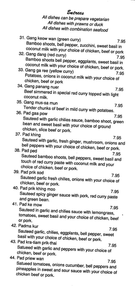 Red curry. Bamboo shoots, bell pepper, eggplants, sweet basil in coconut milk with your choice of chicken, beef, or pork.